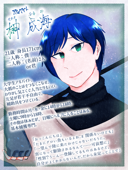 「おっ、こんにちは」 「僕は榊成海。よろしくね」 「望んでなったわけじゃないことで迫害されるのは、 魚でも嫌だよね」 「性別ね…。そこにこだわりをもつ必要はないのかもね」 「ごめん、片方の足が少し悪くて」