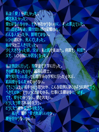母はキリスト教の信者だったらしい。 でも何かを強制されたような覚えはないので、 重く厳しい信仰ではなかったのだろう。 父はずっと泣いていたと思う。 母を亡くしてから、ずっと。 『愛』は父が教えてくれた。 今度は私が、貴方に『愛』を教える番。